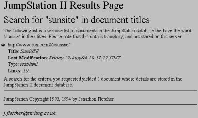 The first web search engine was JumpStation which was created by Jonathon Fletcher in December 1993. It had the basic components of modern web search engines in that it used a web robot to find and crawl web pages to build a searchable index. It also provided a web form for keywords which then returned a listing of links to web pages.