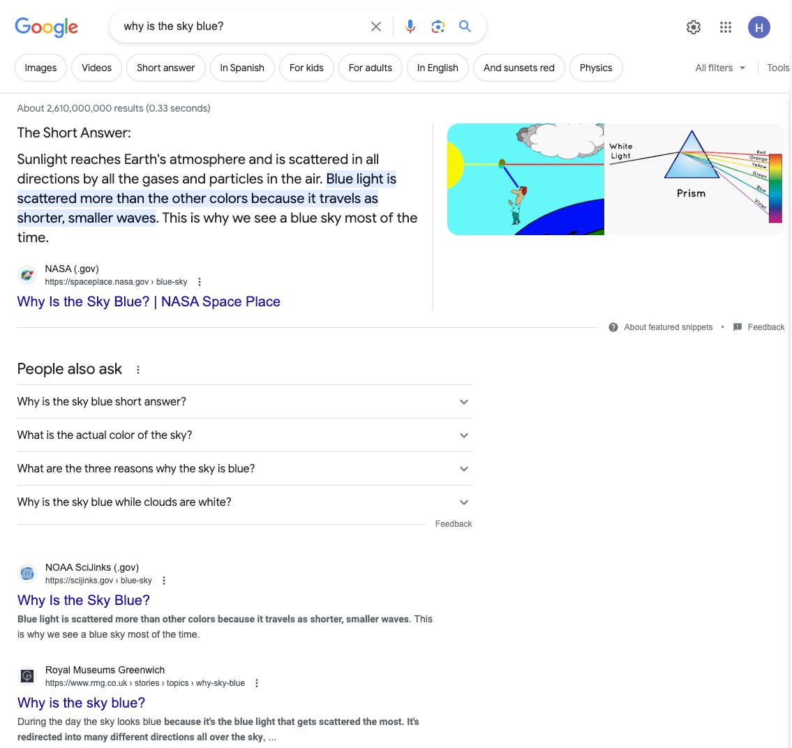 Users turn to search engines because they’re trying to find an answer to a question they have in their minds and/or to achieve a task or goal. For simple questions such as “Why is the Sky Blue?” Google does a great job of answering the question via a knowledge panel with a link to an authoritative source.