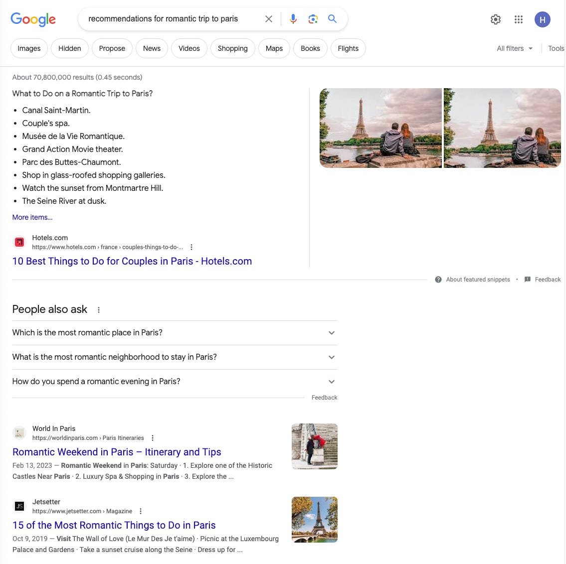 For more complex questions or tasks where there isn’t a one size fits all answer, it becomes more difficult. For example, here’s what Google shows for “recommendations for romantic trip to Paris”